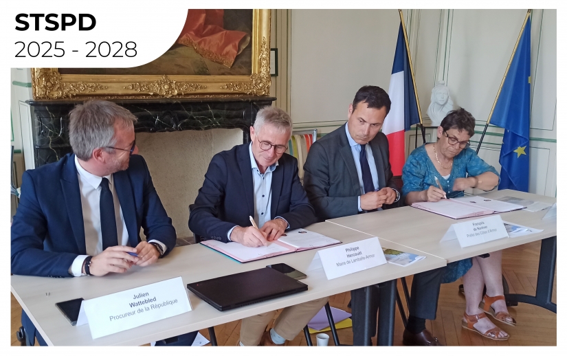 Légende photo : Mercredi 11 juin 2025, la signature officielle de la STSPD a eu lieu à l'Hôtel de Ville de Lamballe-Armor par Julien Wattebled - Procureur de la République de Saint-Brieuc, Philippe Hercouët - Maire de Lamballe-Armor, François de Keréver - Préfet des Côtes d'Armor et Christine Orain-Grosvalet, vice-présidente au Conseil départemental en charge de l'insertion et de l'égalité entre les hommes et les femmes.